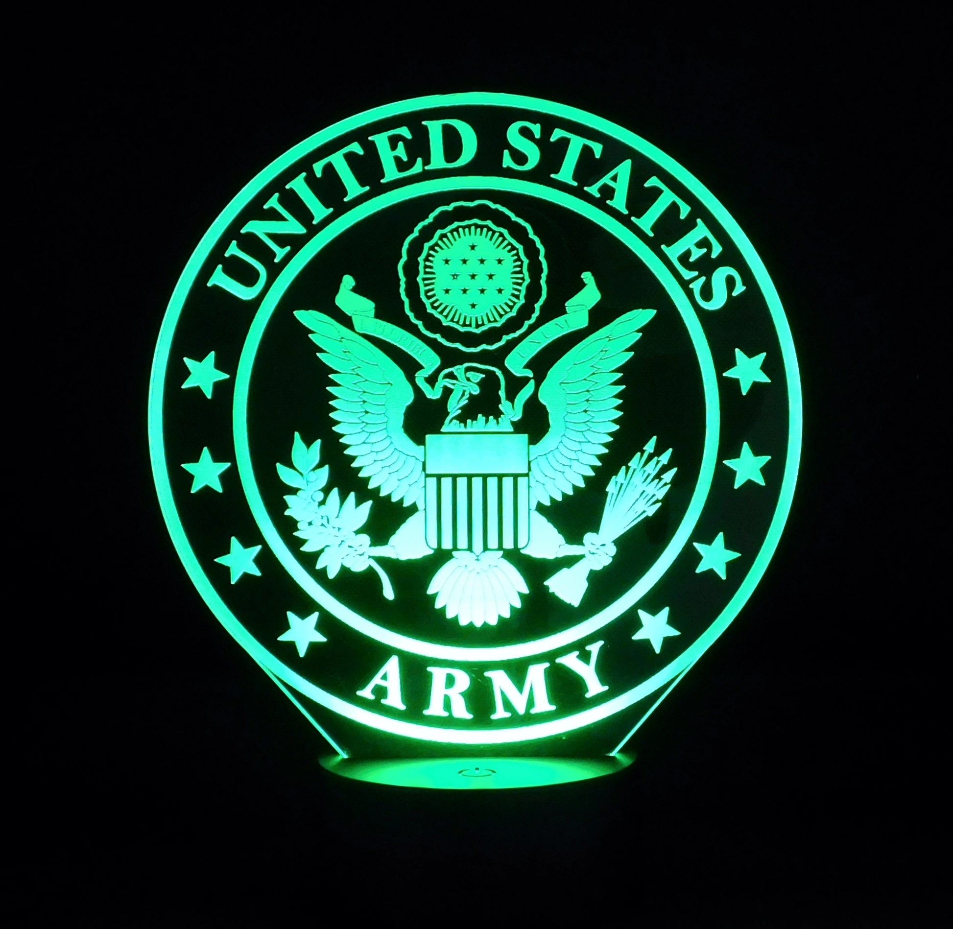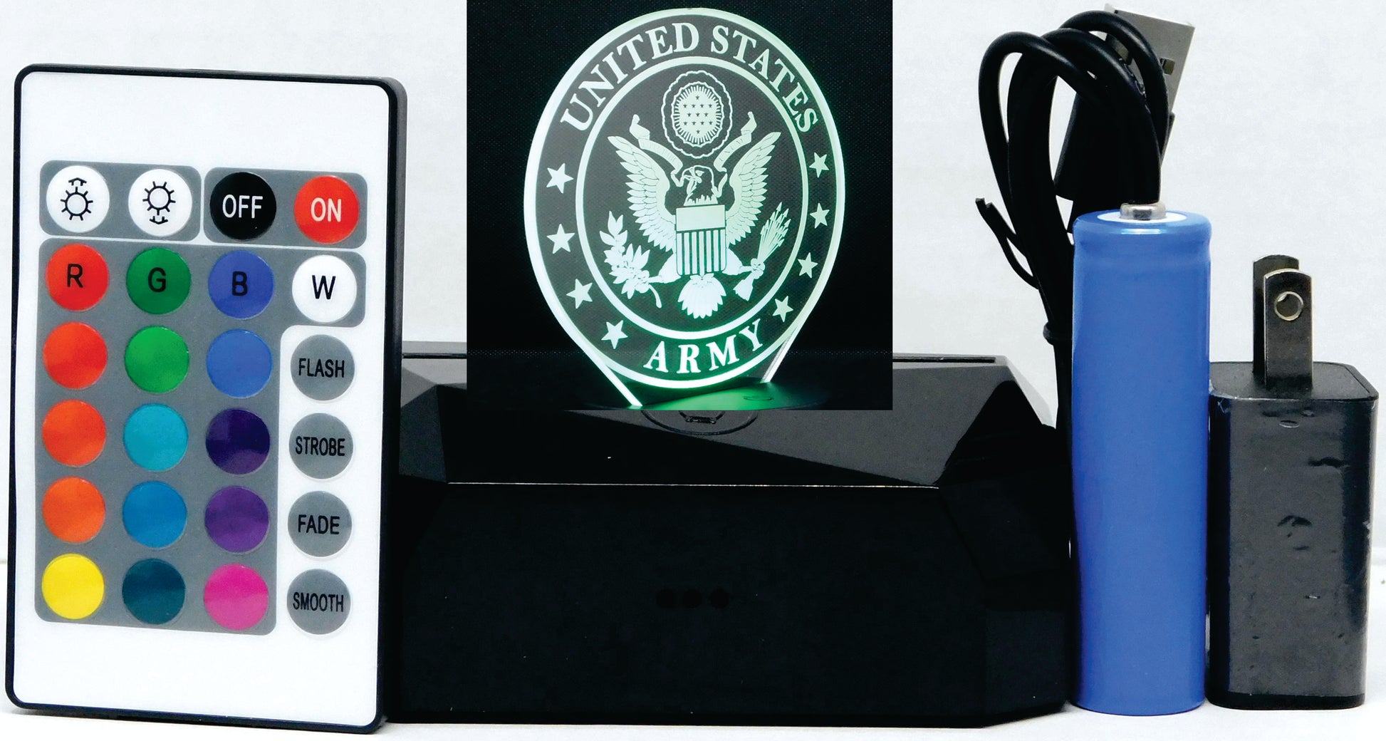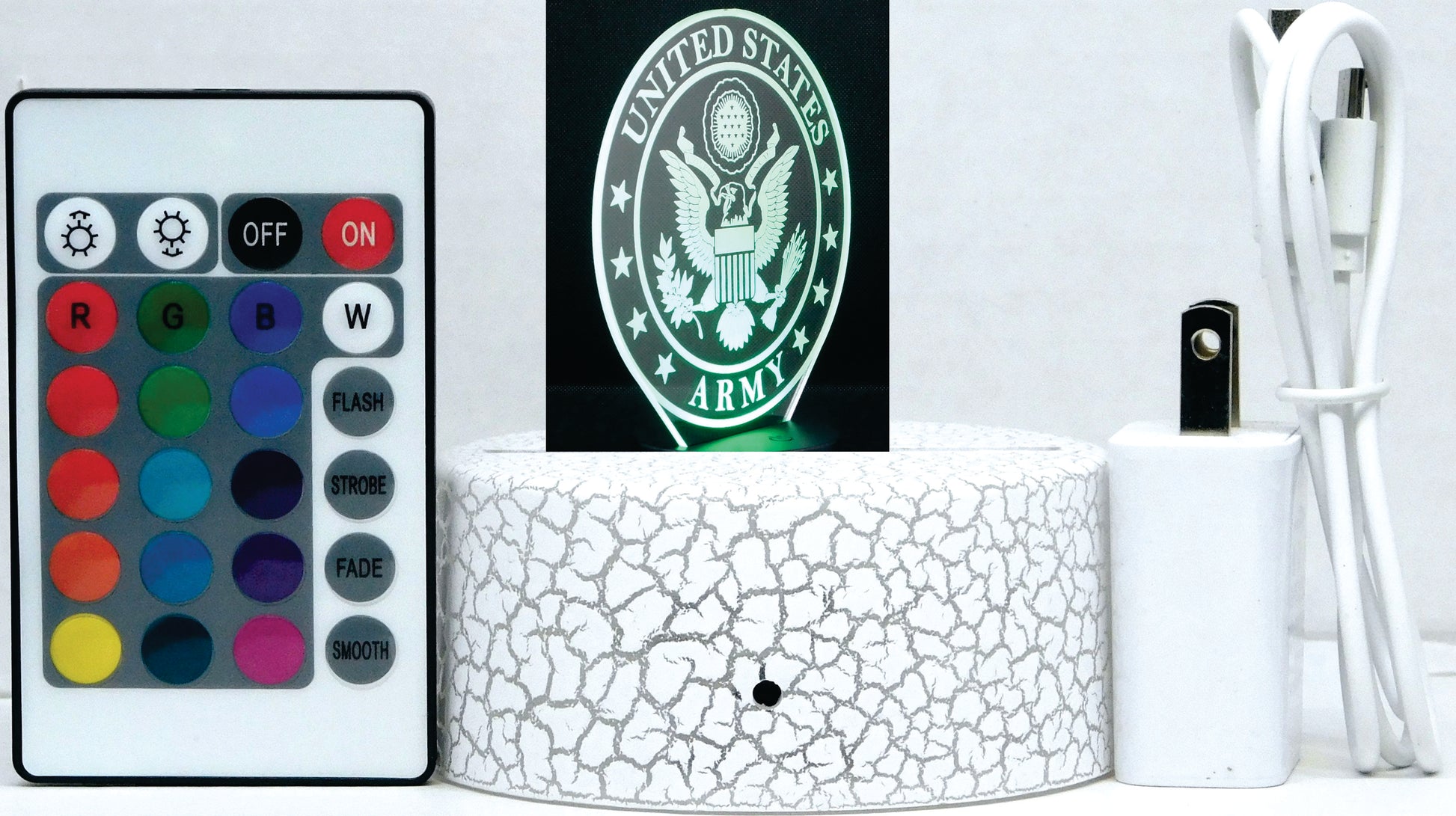 Show your support for the military with this unique Army Logo 3-D Optical Illusion Multicolored Light. This striking light creates a vivid 3-D illusion with a powerful LED lamp, perfect for showing appreciation for the brave men and women fighting for our freedom. With multiple base options, you'll be sure to find the perfect gift for every patriot. Salute the Army in an unforgettable way!