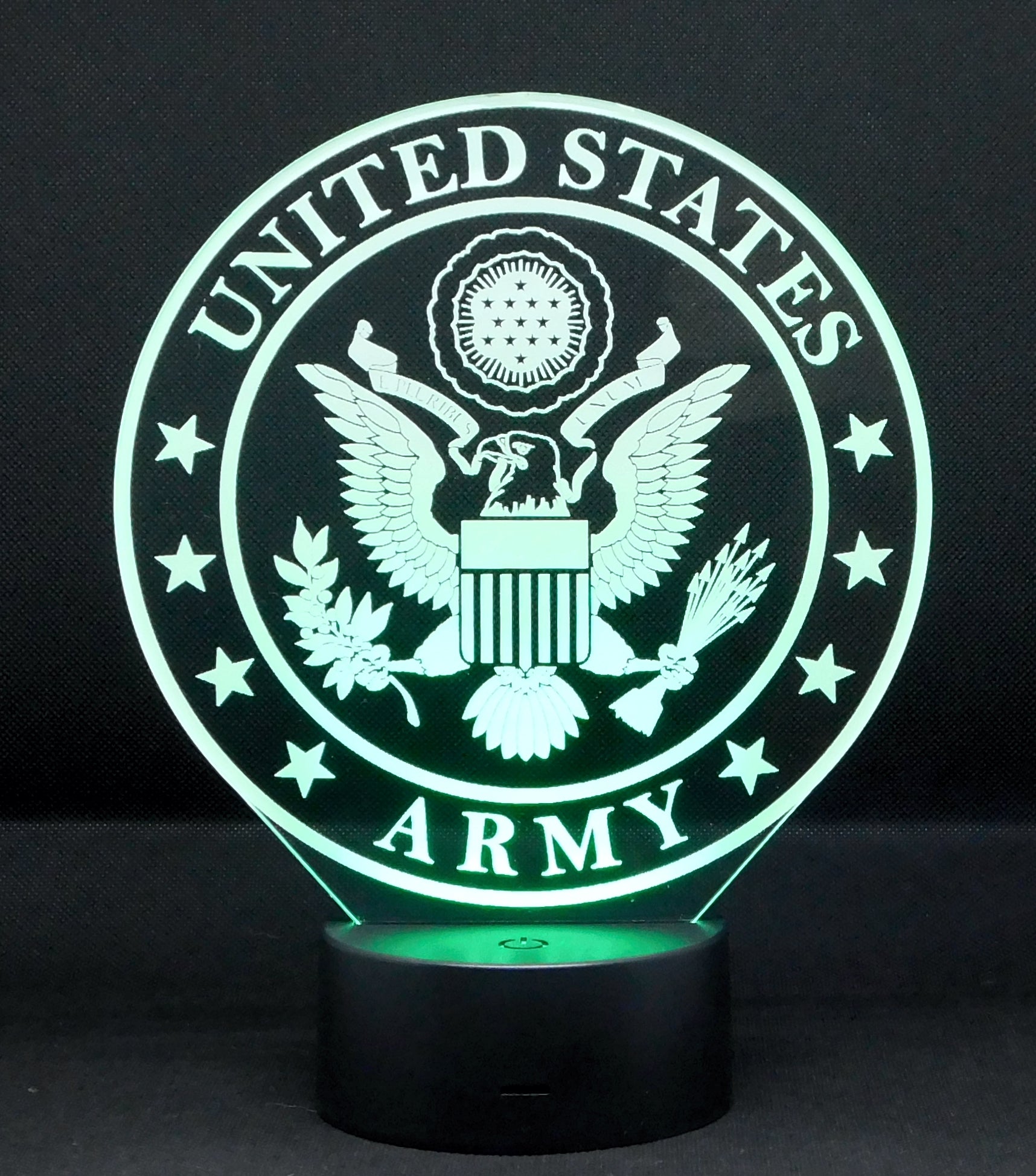 Precision Laser Cut and Etched acrylic is edge lit with a soft glow to illuminate the Army logo, especially in a darkened area.