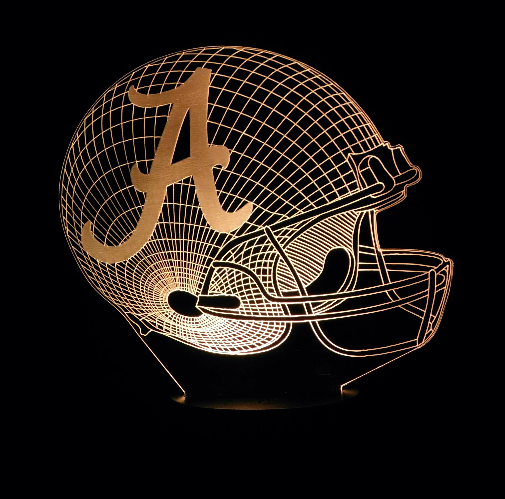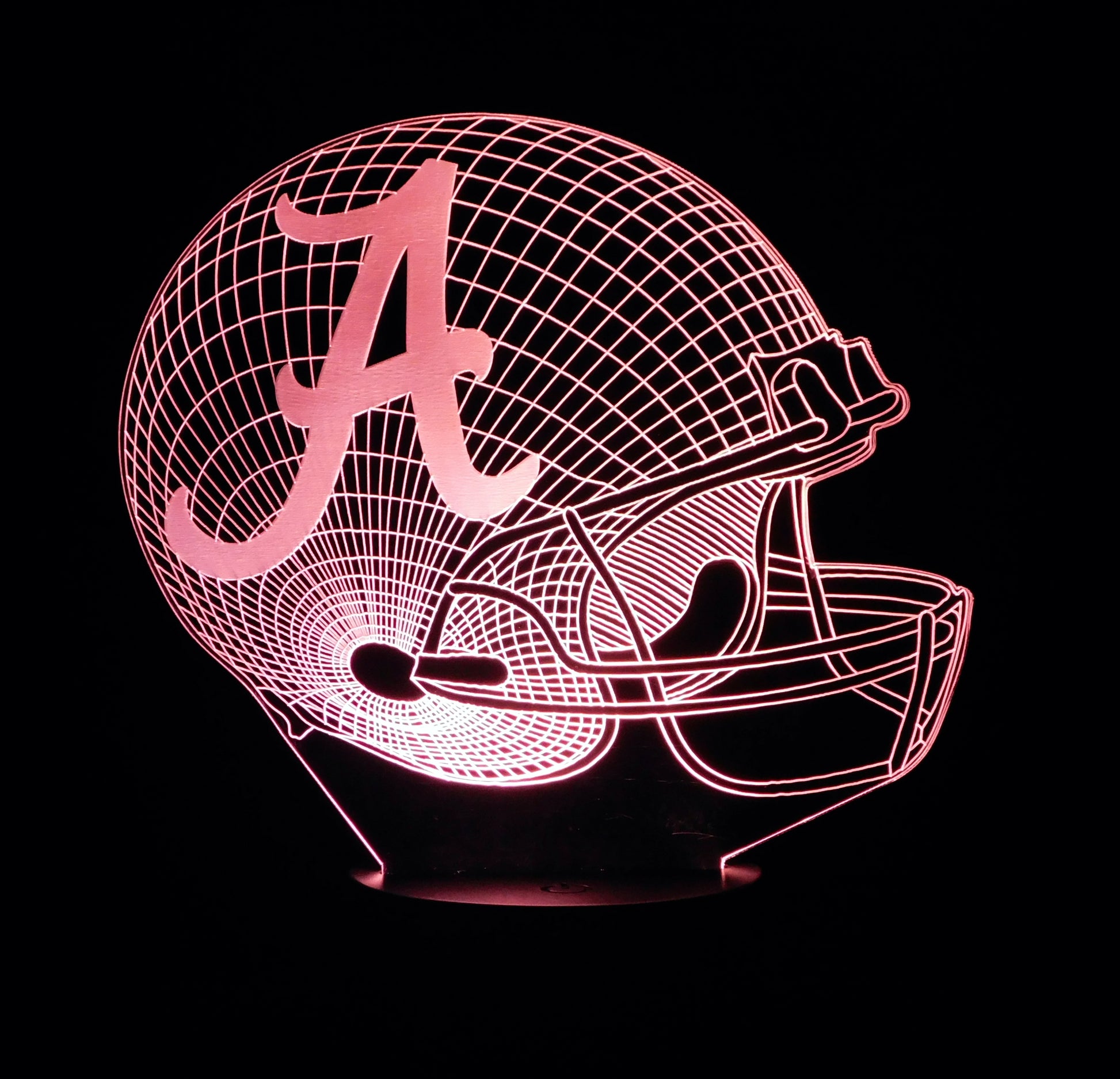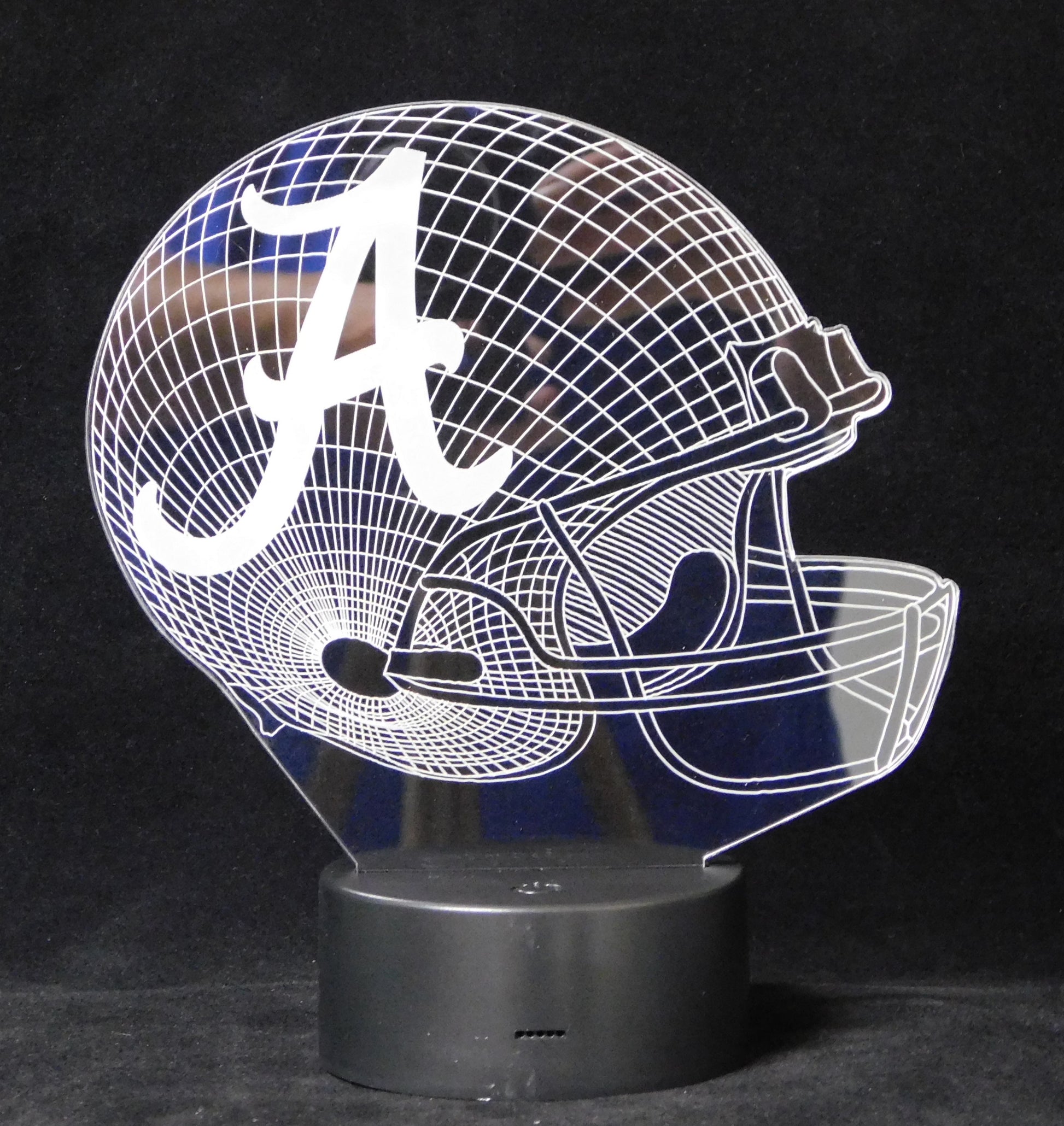 Precision Laser Cut and Etched acrylic is edge lit with a soft glow to provide a 3-D illusion effect, especially in a darkened area. Your team logo is laser etched in the center of the helmet.