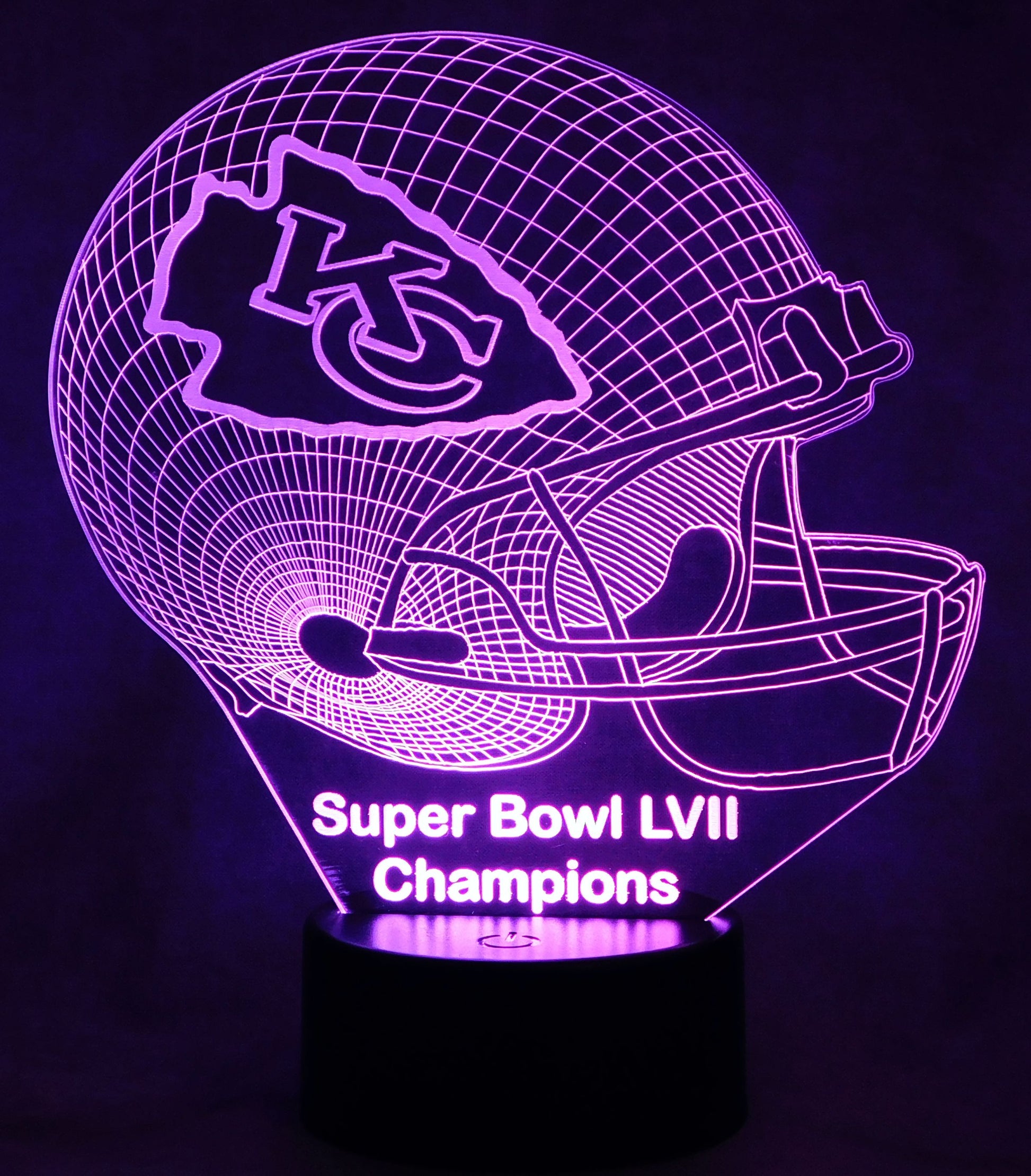 Precision Laser Cut and Etched acrylic is edge lit with a soft glow to provide a 3-D illusion effect, especially in a darkened area. Your team logo is laser etched in the center of the helmet.