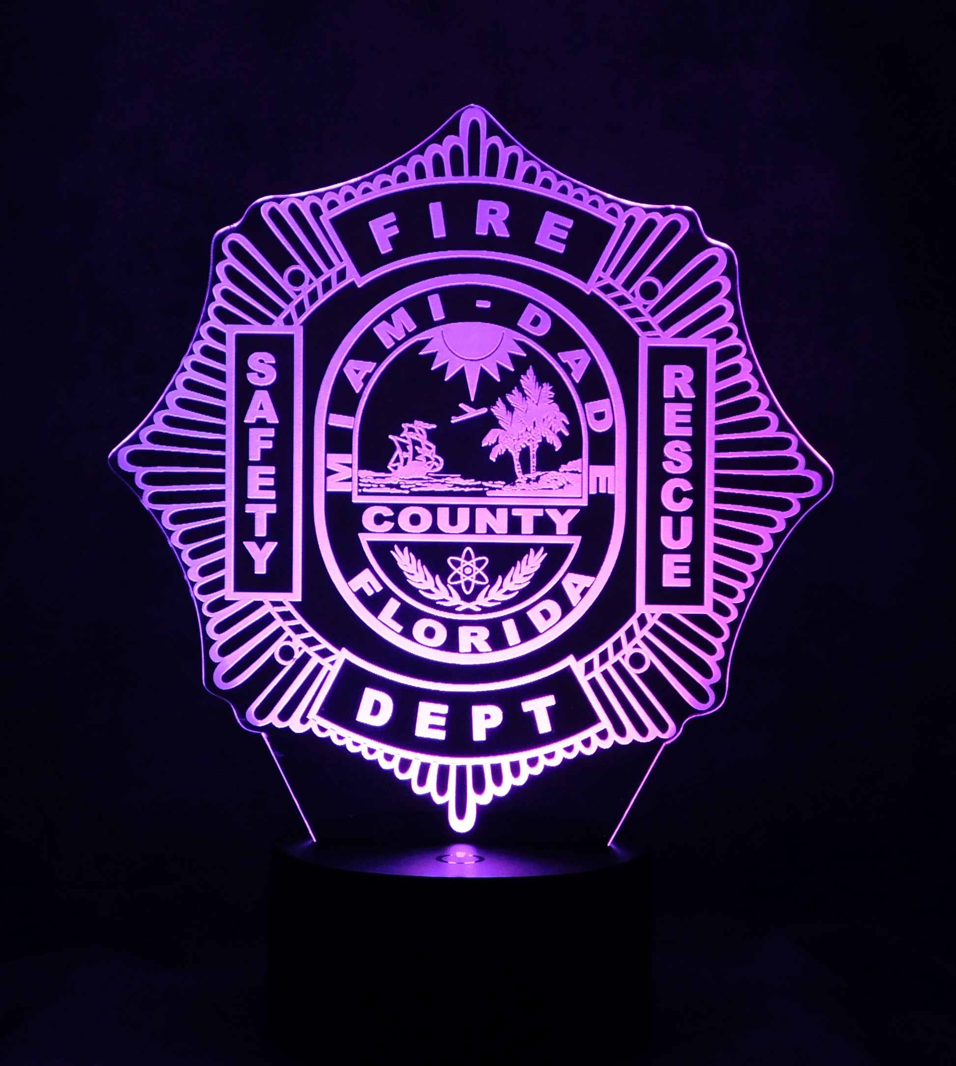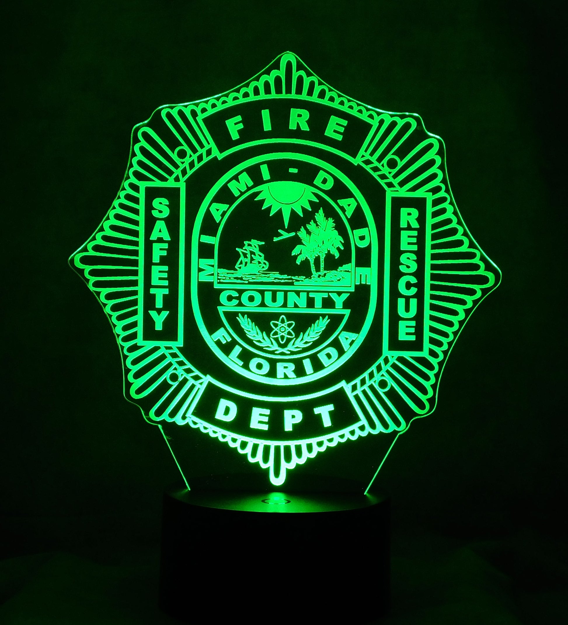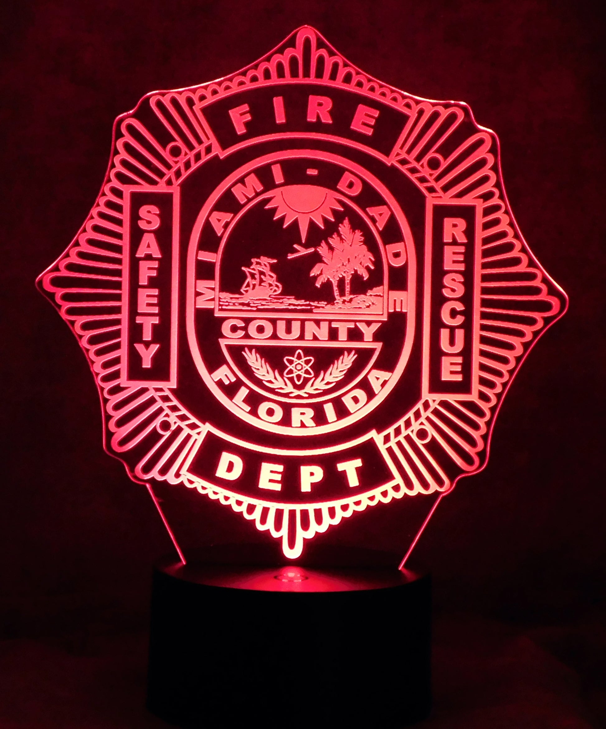Precision Laser Cut and Etched acrylic is edge lit with a soft glow to illuminate the Miami Dade Firefighter logo, especially in a darkened area.