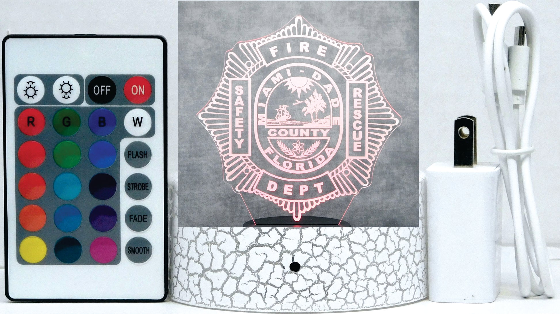 Show your appreciation for Miami Dade Firefighters with this stunning 3-D LED lamp! Featuring the beloved Miami Dade Firefighter logo, the optical illusion is sure to be a talking point in any space. Choose from multiple base options to match your decor, and enjoy the gentle illumination of this special nightlight. Show your support today!