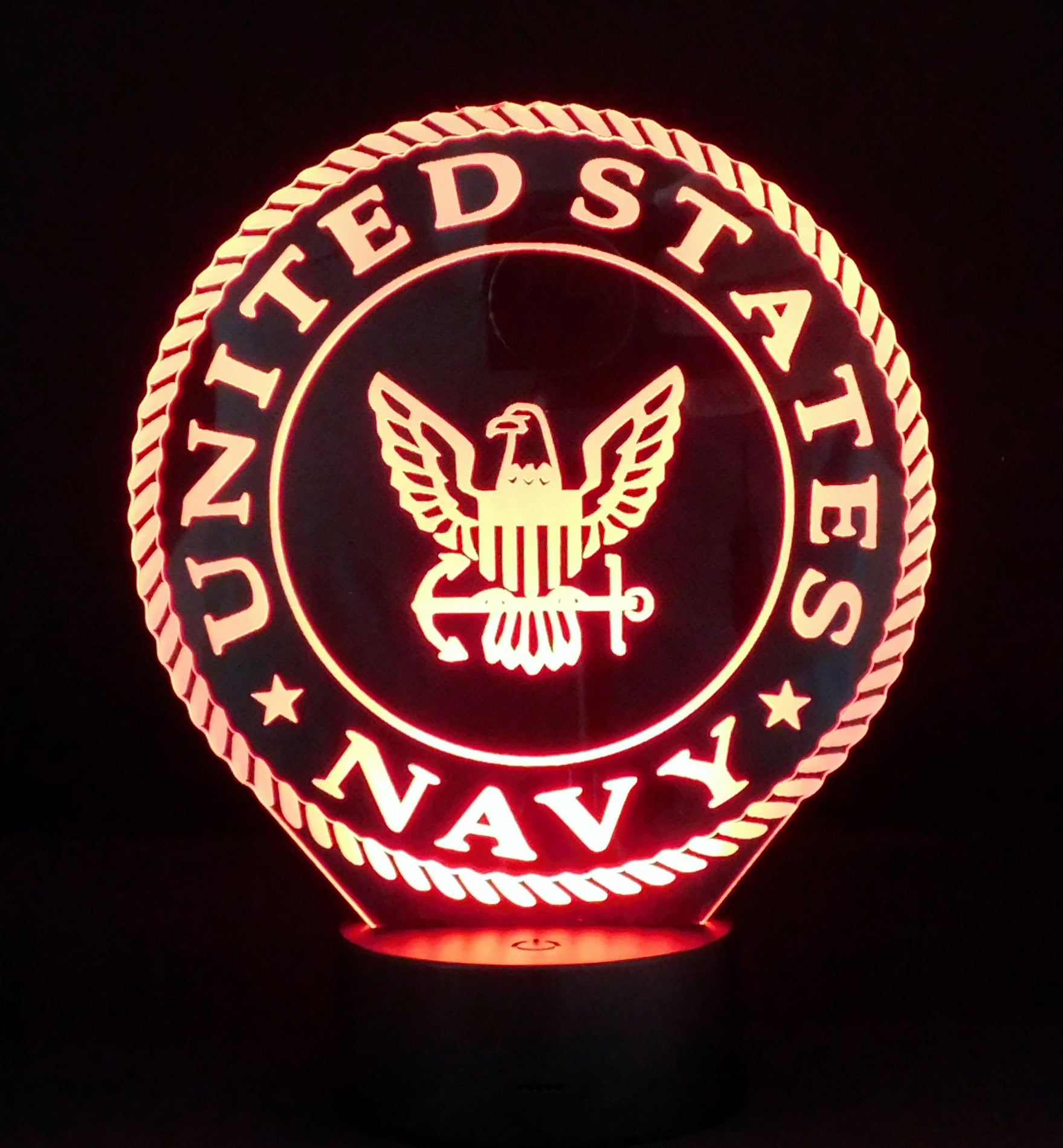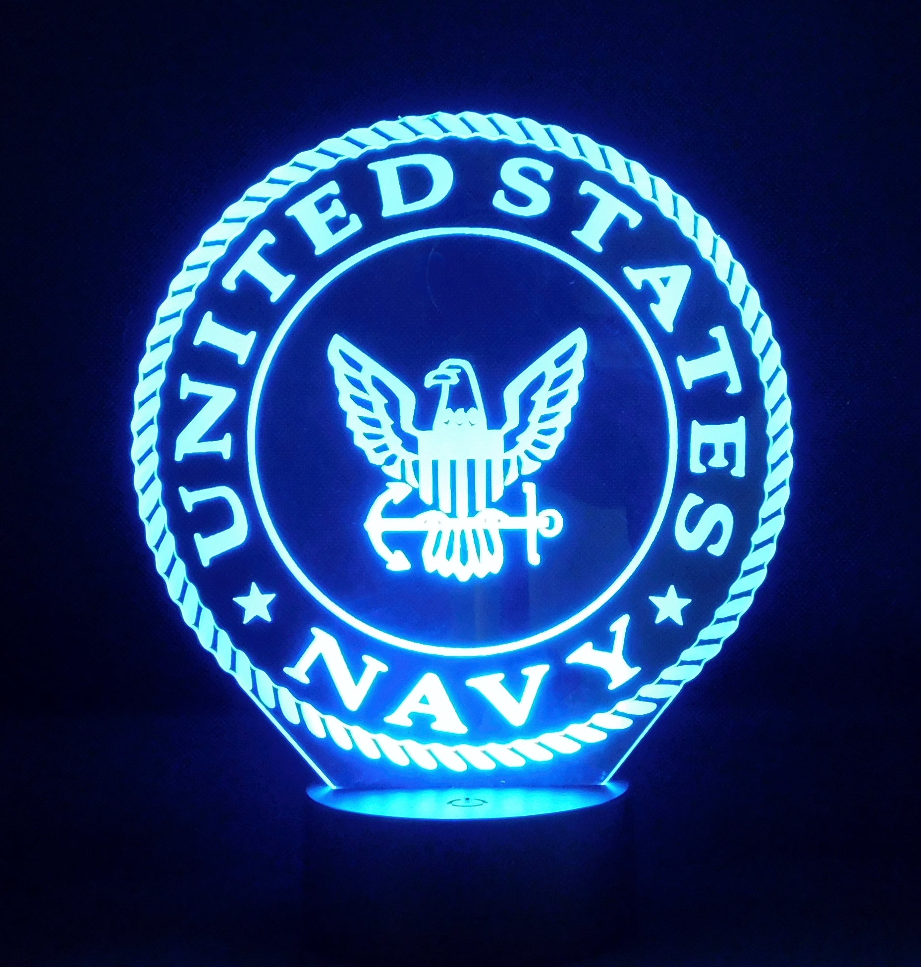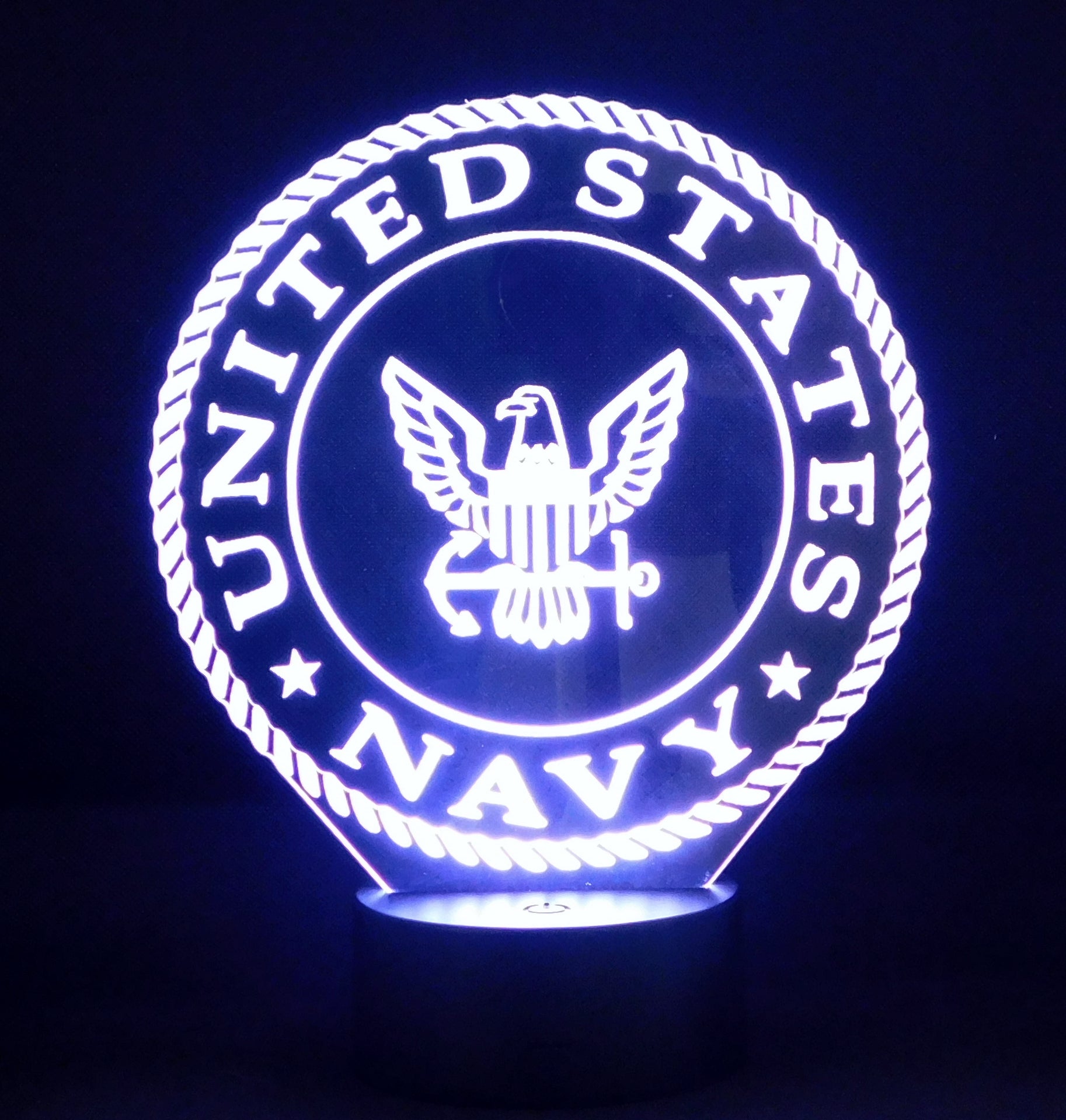 Precision Laser Cut and Etched acrylic is edge lit with a soft glow to illuminate the Navy logo, especially in a dark area.