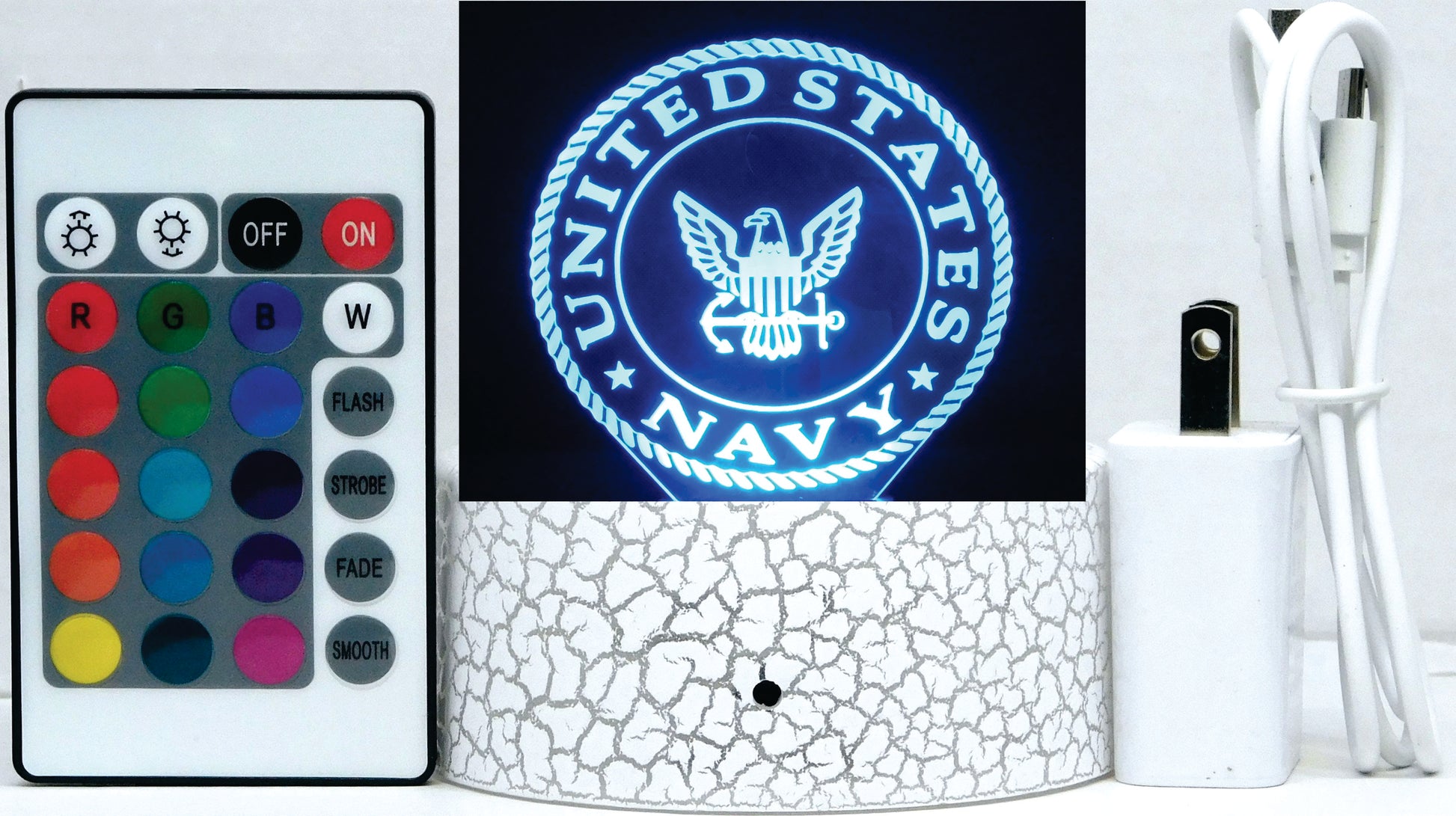 Light up any room with this stylish Navy Logo 3-D Optical Illusion LED Lamp! It's a creative and unique way to show your appreciation for your favorite Navy personnel. With unique 3-D optical illusion rendering and multicolored LED lighting, this lamp is sure to make a statement. Choose from multiple base options for the perfect lighting experience!