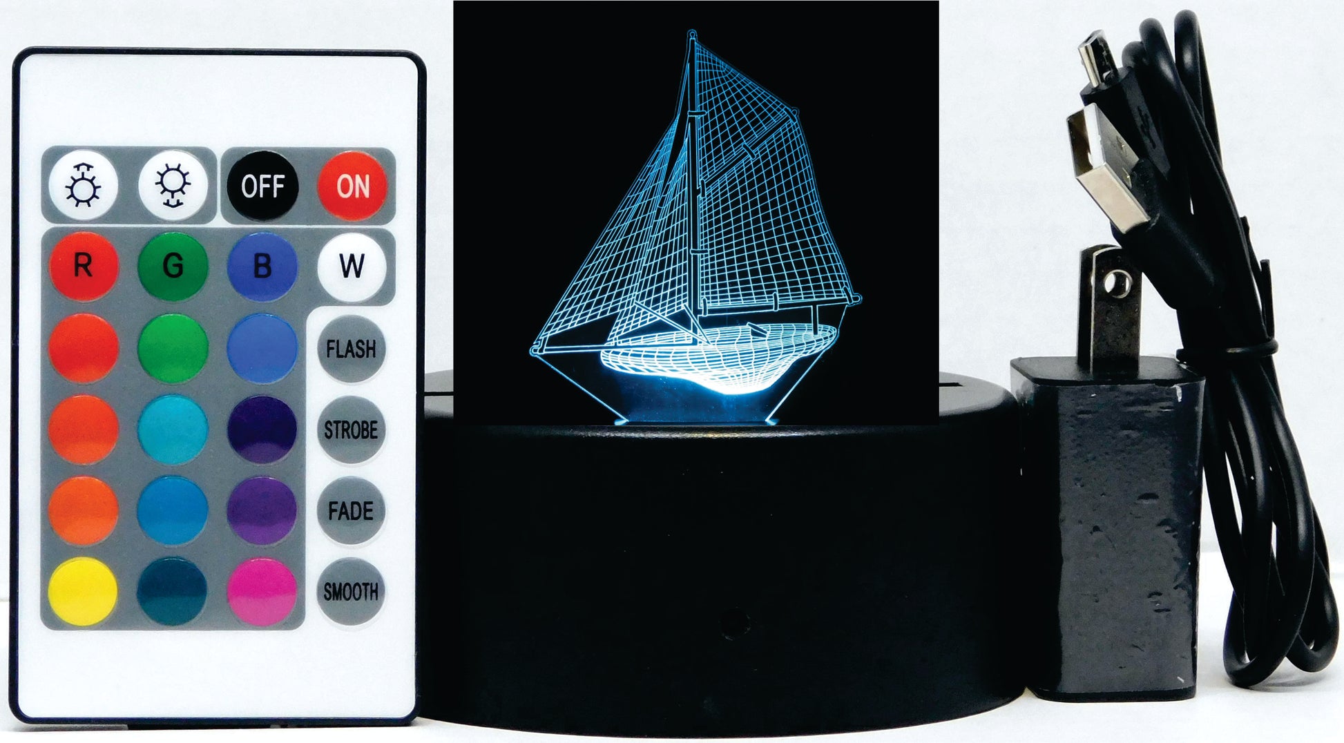 Discover this enchanting Sailboat 3-D Optical Illusion LED Desk, Table, and Night Lamp! With its captivating 3-D illusion, this awesome lamp will make a decorative statement any time of the day. Get creative and choose between the multiple base options to customize the look. For yourself or as a gift, this enchanting lamp has you covered!